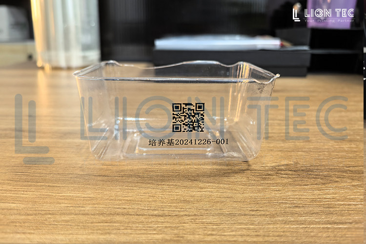培養(yǎng)基器皿弧形的塑料材質表面通過UV噴碼機打印的二維碼,效果高清晰,高識別