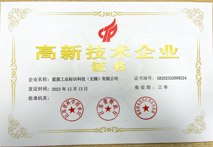 近日,藍(lán)茵工業(yè)標(biāo)識科技(無錫)有限公司喜獲國家級“高新技術(shù)企業(yè)證書”,成為國家高新技術(shù)企業(yè),并頒發(fā)了證書。此次藍(lán)茵LIONTEC取得的《高新技術(shù)企業(yè)證書》,發(fā)證審批機關(guān)分別為江蘇省科學(xué)技術(shù)廳、江蘇省財政廳、國家稅務(wù)總局江蘇省稅務(wù)局。證書的頒發(fā)充分說明了國家相關(guān)部門對藍(lán)茵