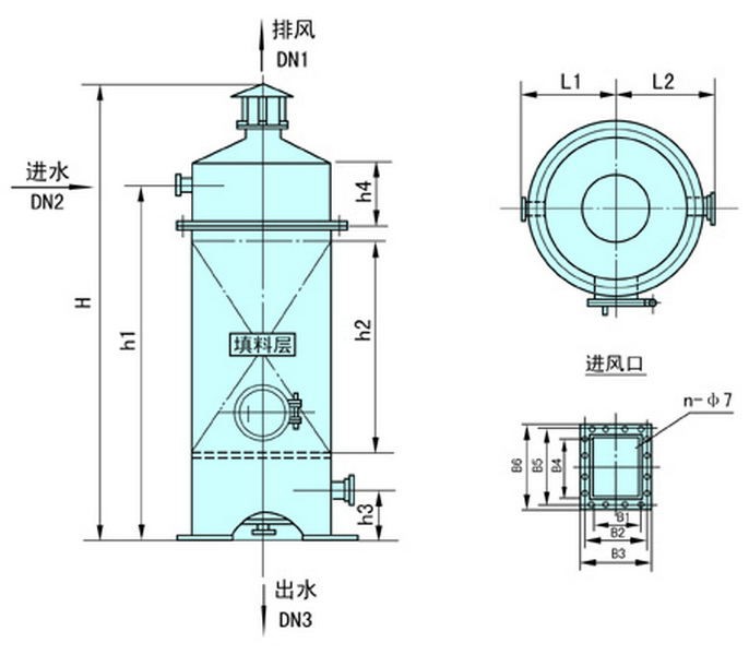 脫氣塔由進水裝置,填料,風(fēng)機,水箱組成,進水裝置一般采用母支管布水,材質(zhì)根據(jù)不同的需要可以選用304繞絲管和316繞絲管,填料選用多面空心球,根據(jù)水質(zhì)不同可以選用陶瓷和塑料兩種,他主要是起到加大水的表面積,使二氧化碳較好的被吹脫、風(fēng)機主要是提供風(fēng)源,從而對水的二氧化碳進行吹脫、儲水箱使處理后的水儲存,可以通過增壓泵打到后續(xù)的設(shè)備中,除碳器工作時,水從上部進入,經(jīng)配水裝置淋下,通過填料層后,從下部排入水箱,而風(fēng)機的提供的風(fēng)向是逆向的,即從下向上進行吹脫,通過填料層后,由頂部排出。其原理所以當(dāng)鼓入除碳器的空氣流和除碳水相接觸時,水中CO2便會被空氣流帶出。